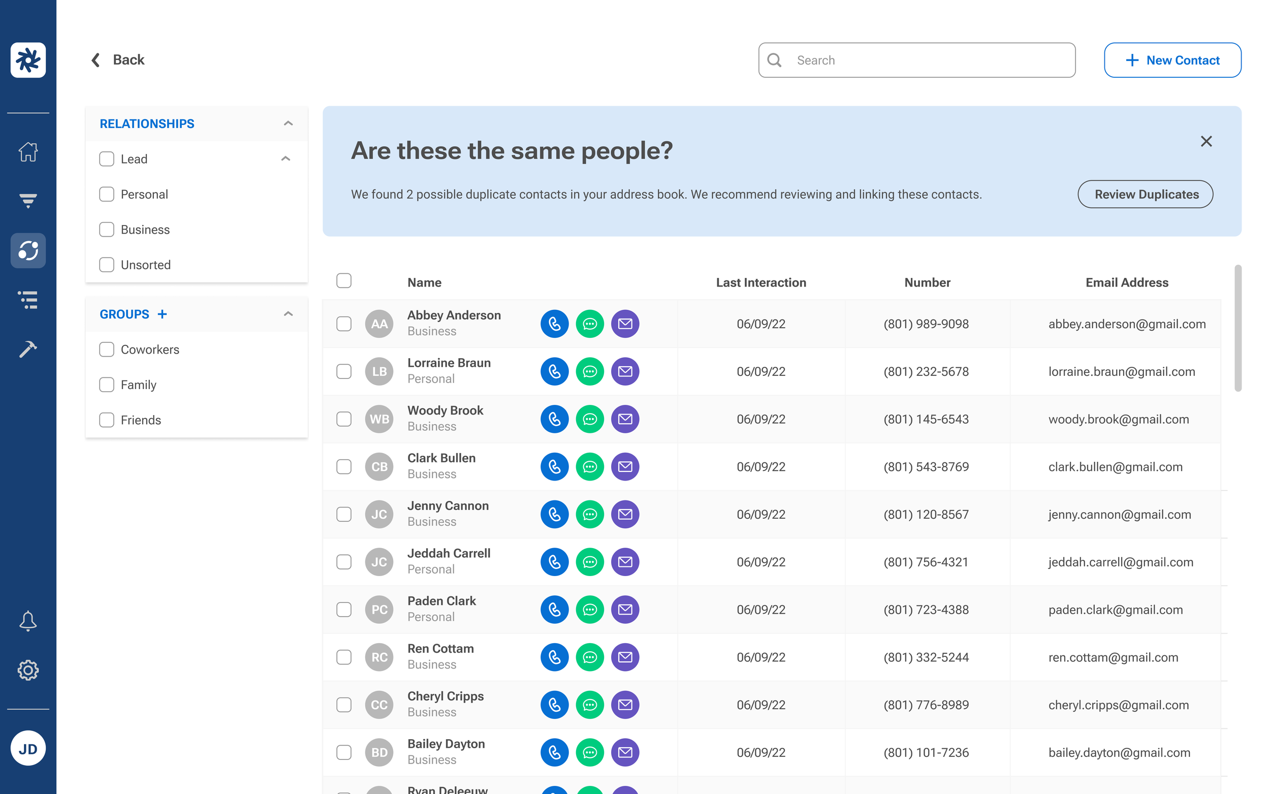 There’s a pretty high chance that users will have the same contact in multiple import sources. So, in order to maintain Sphere’s efficiency, users need an easy way to identify and link duplicate contacts.